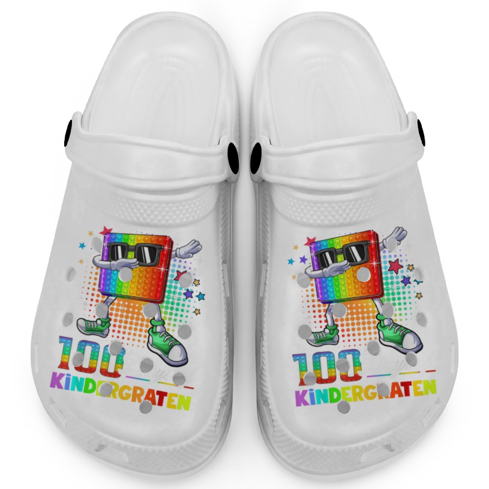 The product unique design you searched for is 100 Days Of Kindergarten School Teacher Clogs For Kids WHITE belong theme Clogs at Printblur