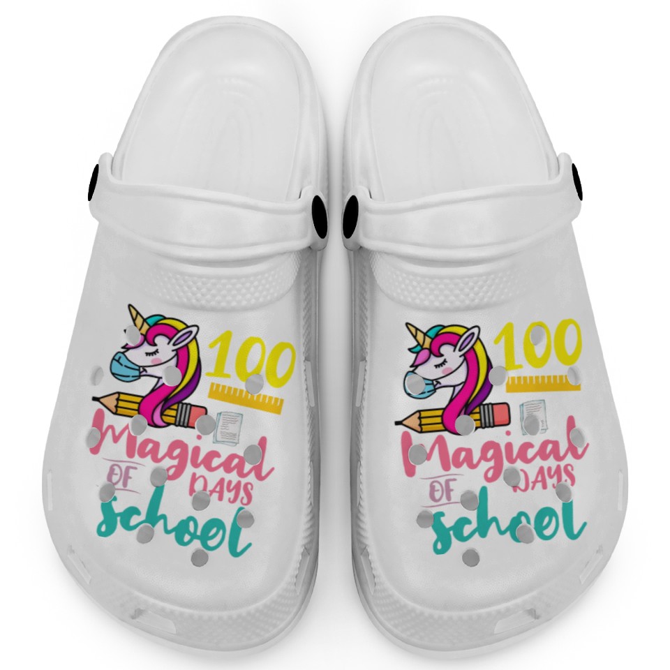 The product unique design you searched for is 100 Magical Days of School Unicorn Teacher Studen Clogs For Kids WHITE belong theme Clogs at Printblur