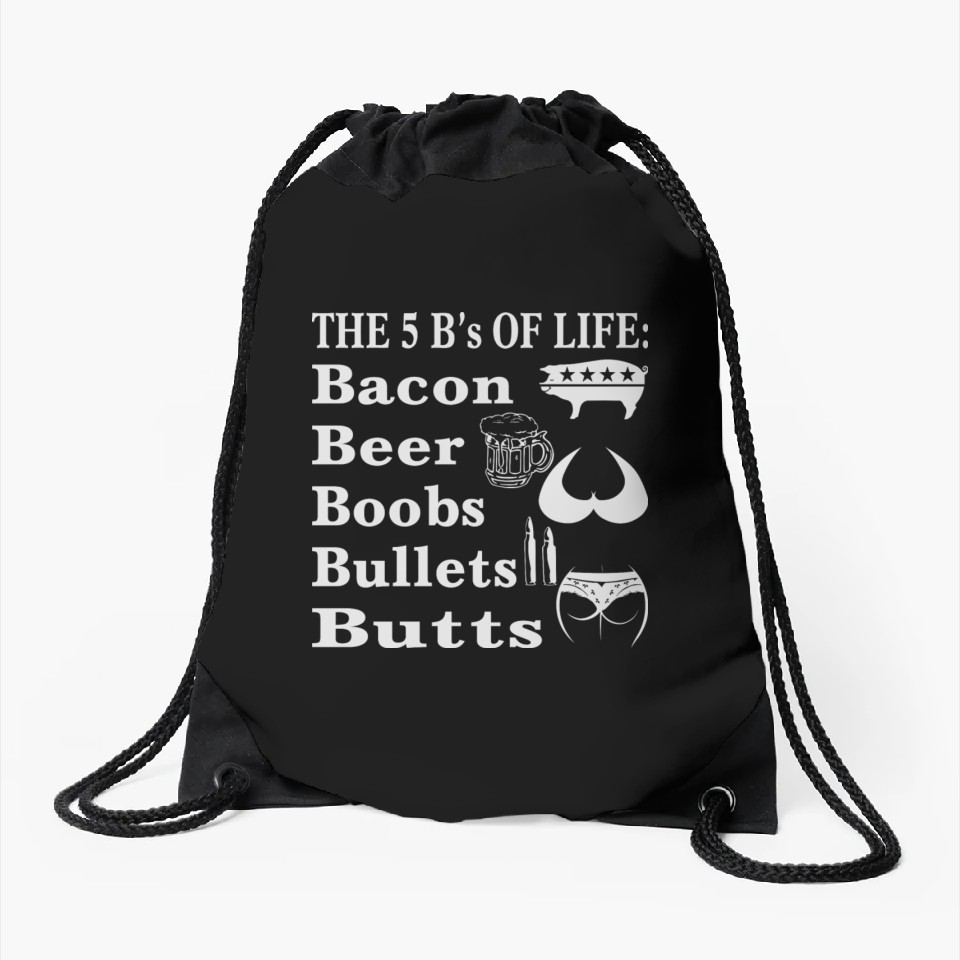 Buy eye-catching 5 B’s Of Life Bacon, Beer, Boobs, Bullets, Butts Drawstring Bags or see more Drawstring Bags products at Printblur shop now to explore many surprises from our shop!