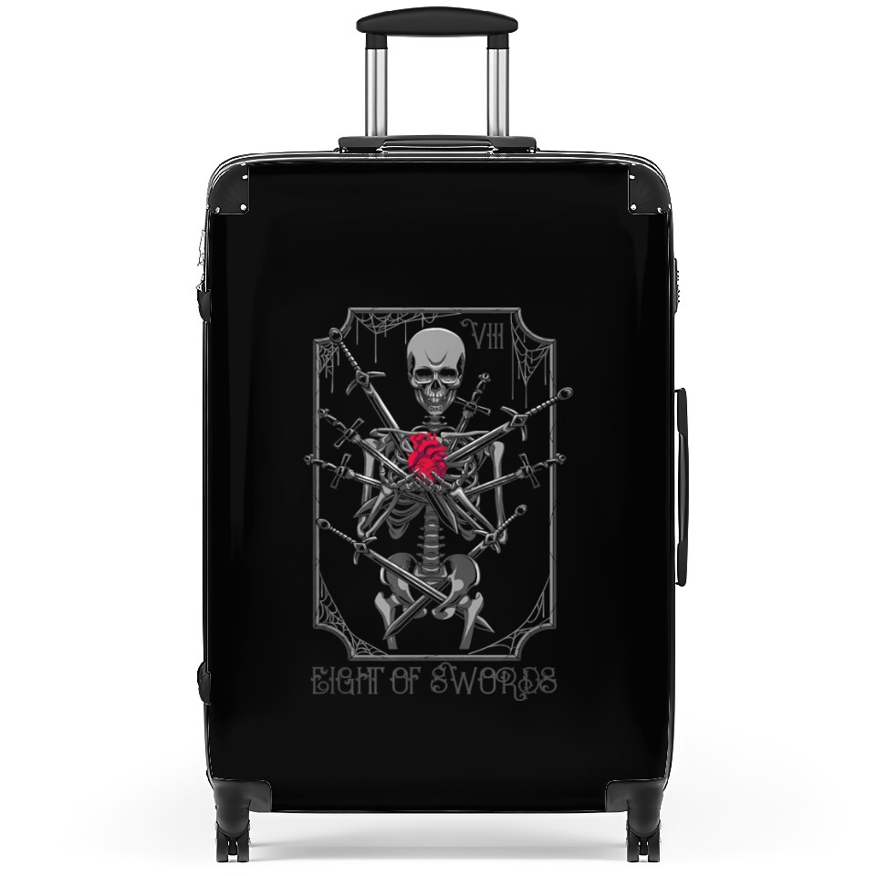 You are viewing an exclusive and elegant product 8 of Swords Tarot Card Skeleton Witchy Pagan Suitcases For Black belong theme Suitcases at Printblur