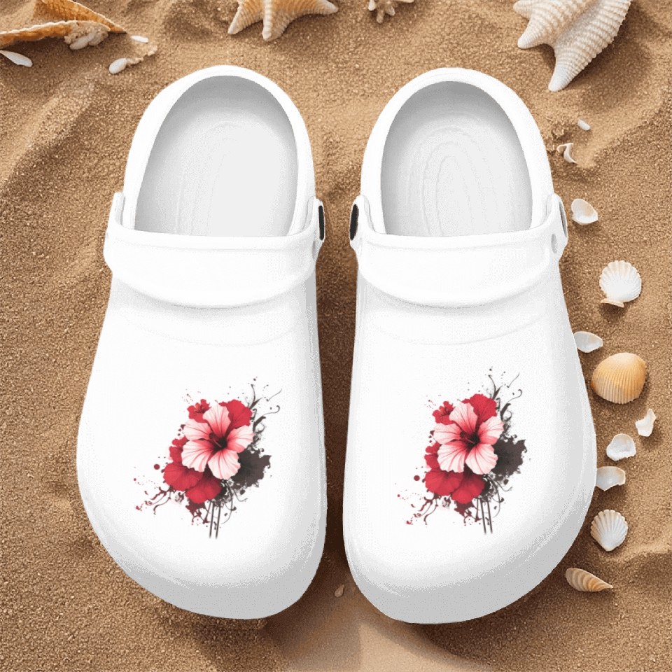 You are viewing an exclusive and elegant product A red hibiscus flower ink drawing Nurse Clogs For Men WHITE belong theme Nurse Clogs at Printblur