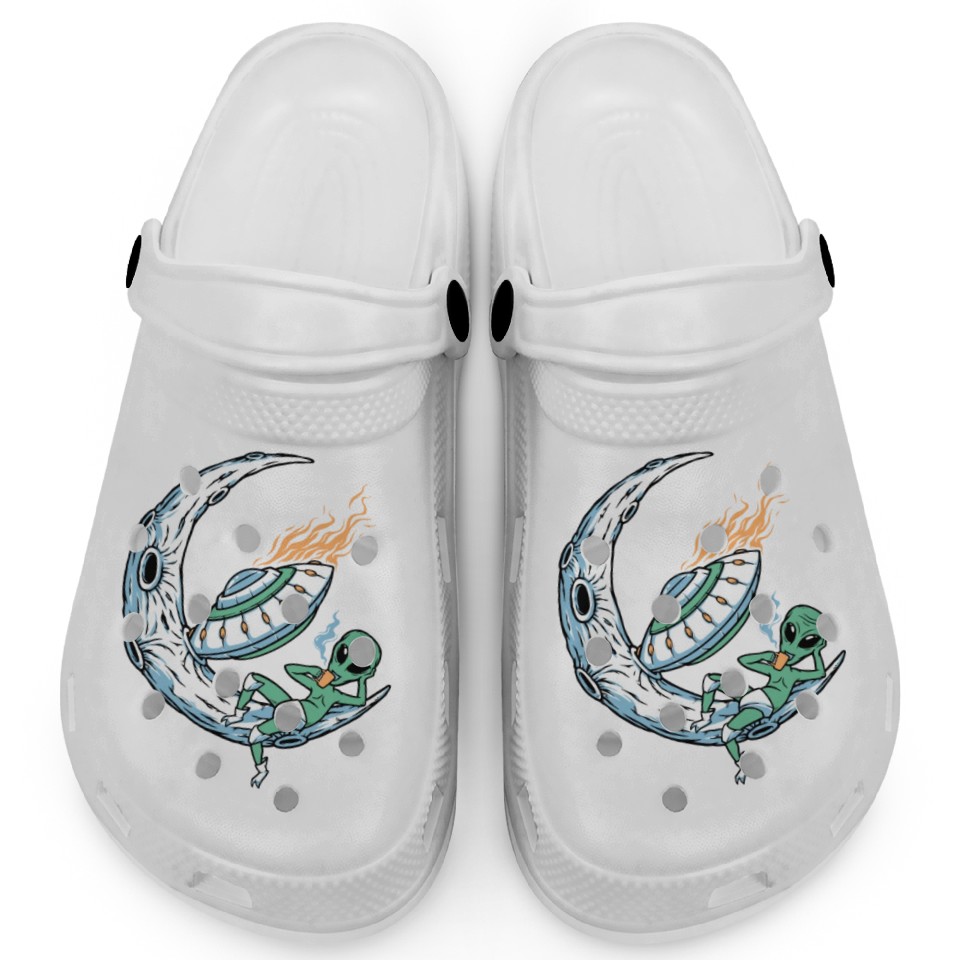 The item hot trend you're looking at is Alien lounging on moon coffee Clogs For Kids WHITE belong theme Clogs at Printblur