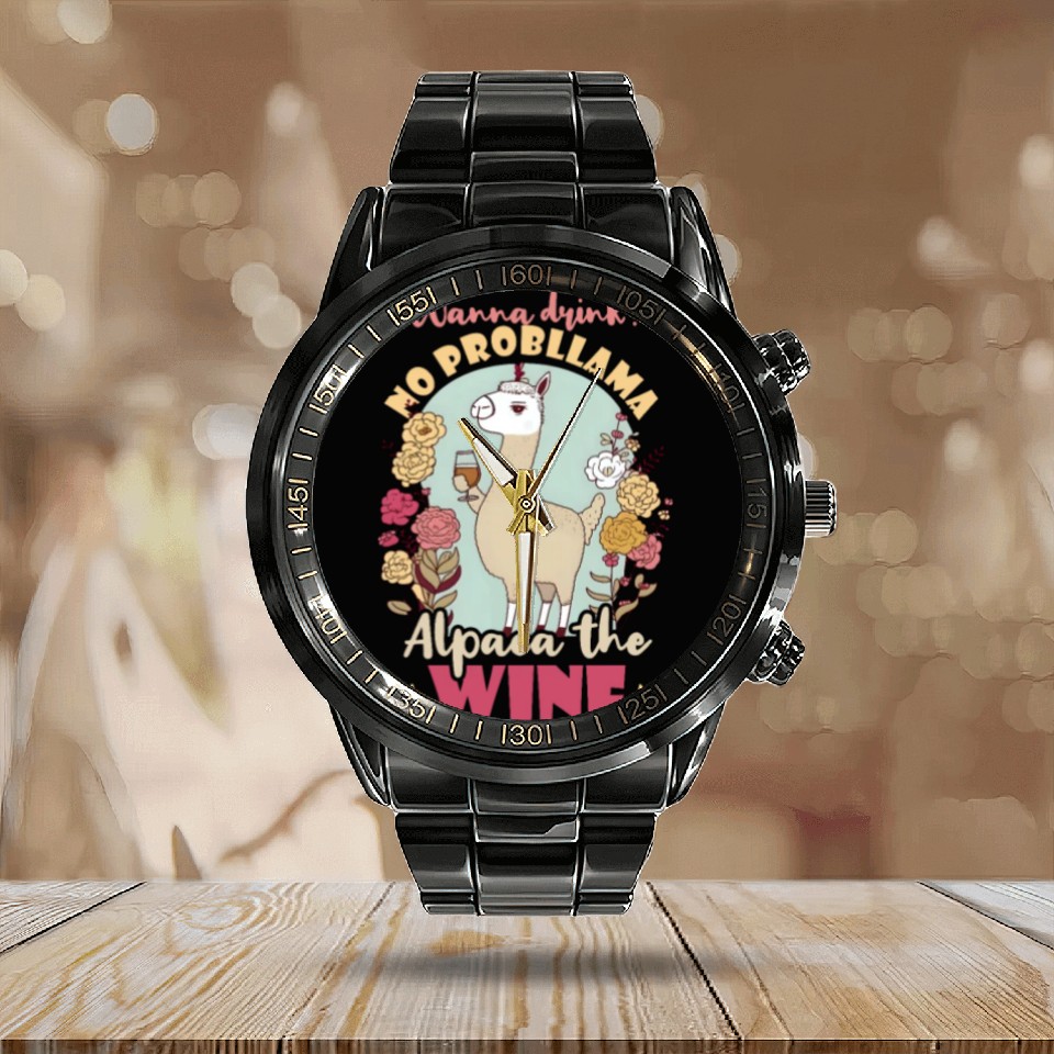 The item hot trend you're looking at is Alpaca Llama Wanna Drink Alpaca Wine Calendar Steel Band Watch For Black belong theme Calendar Steel Band Watch at Printblur