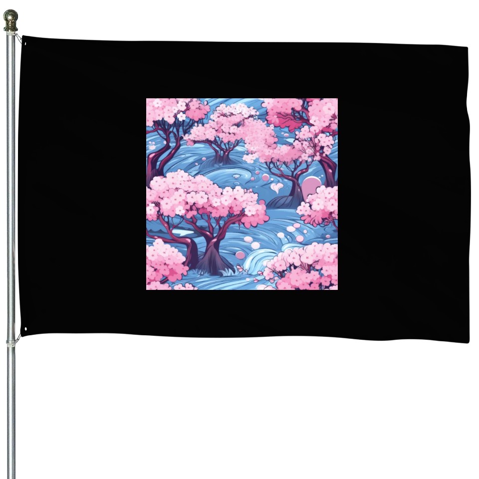 You are viewing an exclusive and elegant product Anime Euphoria: Fantasy Cherry Blossom Dreamscape House Flags For Black belong theme House Flags at Printblur