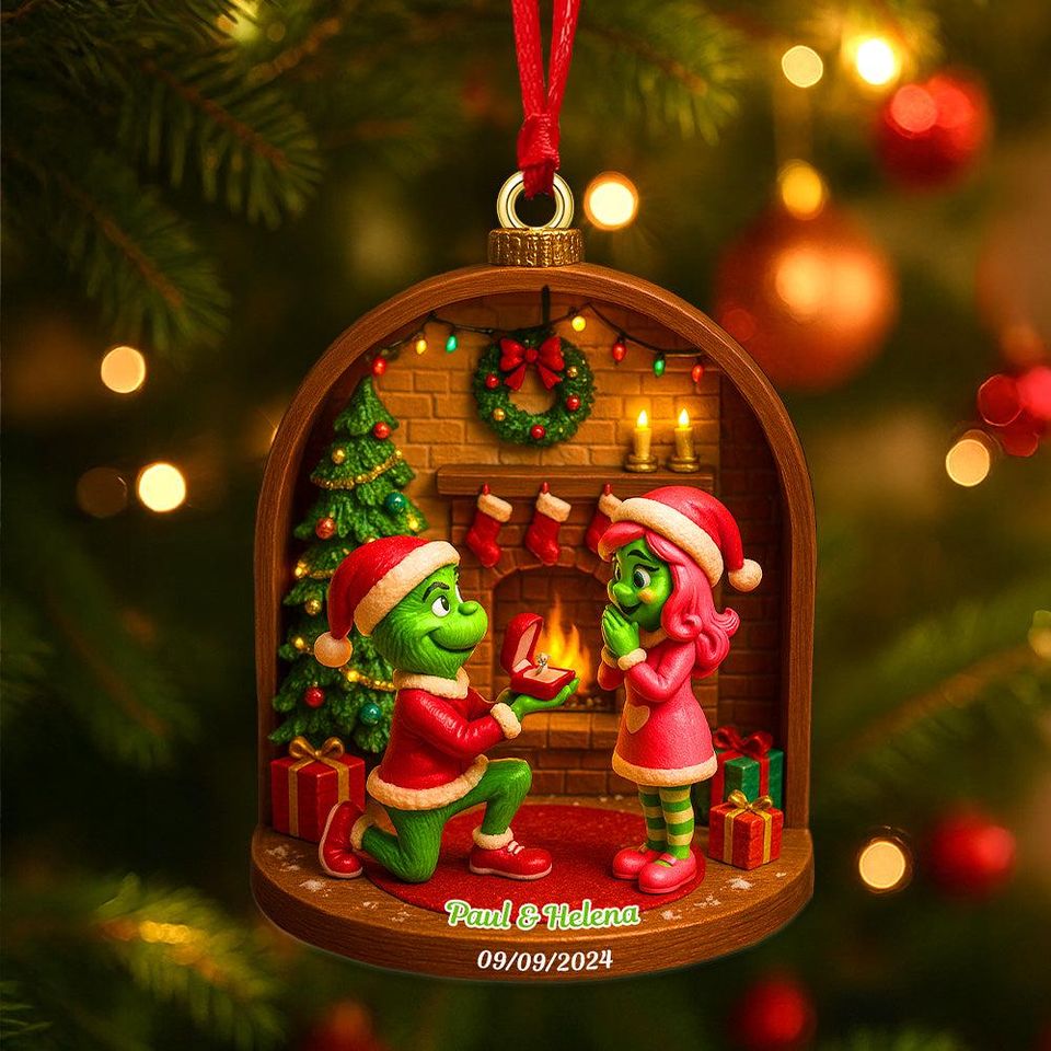 Green Couple Proposal Christmas Ornament Personalized Engagement Gift, Romantic Holiday Decoration