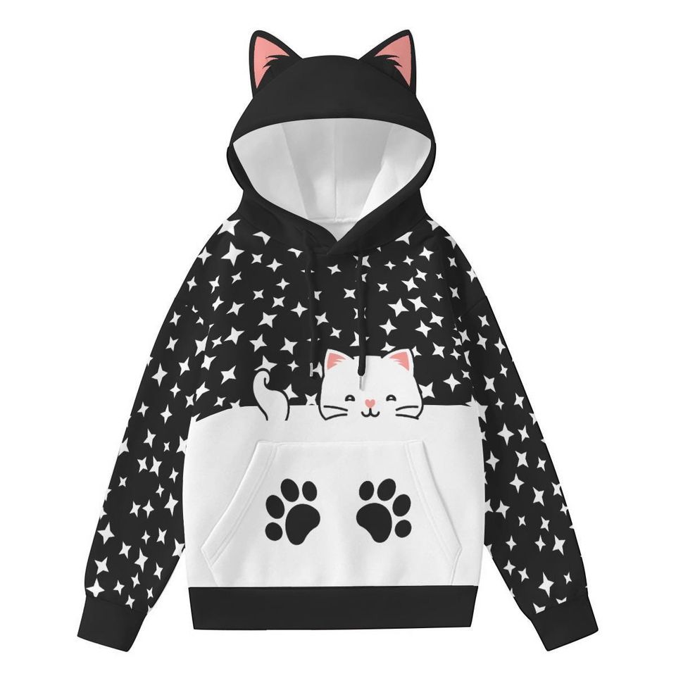 You're taking a peek at the product Kawaii Cat Ear Hoodie: Star Print Pullover with Paw Pocket For Unisex belong theme Cat Ear Hoodies at Printblur