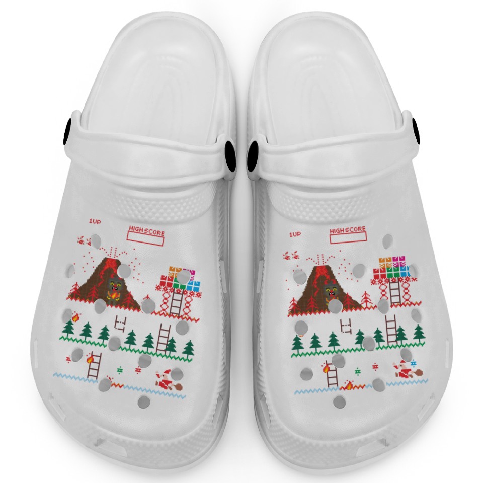 The product unique design you searched for is Santa vs Krampus: Merry 8-bit Christmas Clogs For Kids WHITE belong theme Clogs at Printblur