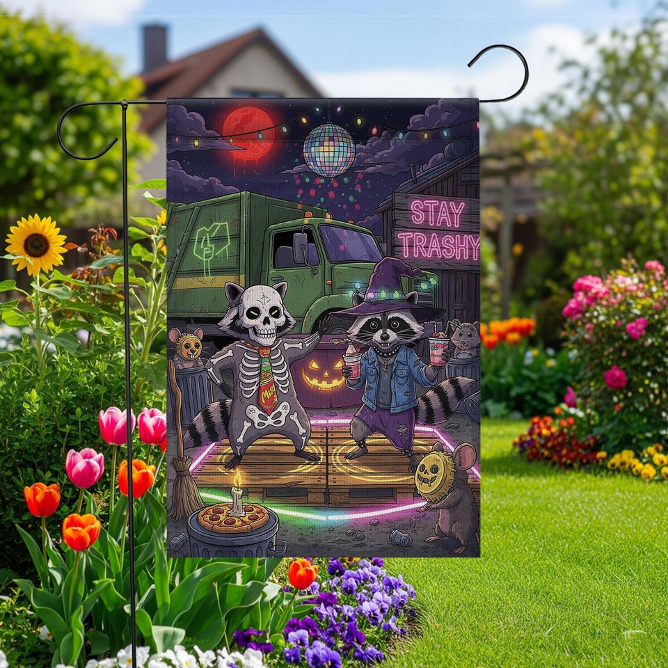 Buy eye-catching Stay Trashy Halloween Garden Flag: Raccoon Skeleton Witch Party Decor or see more Garden Flags products at Printblur shop now to explore many surprises from our shop!