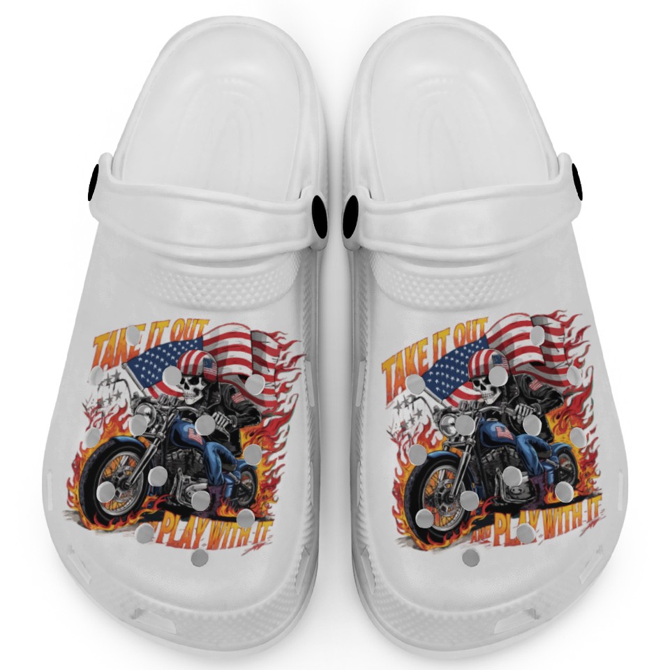 Shop for attractive Take it out play with it USA Flag Skeleton Biker Clogs or see more Clogs products on https://printblur.com right now!