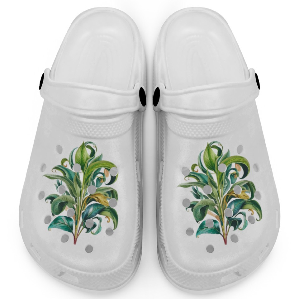 You're taking a peek at the product Watercolor Plant Hand Painted Clogs For Kids WHITE belong theme Clogs at Printblur