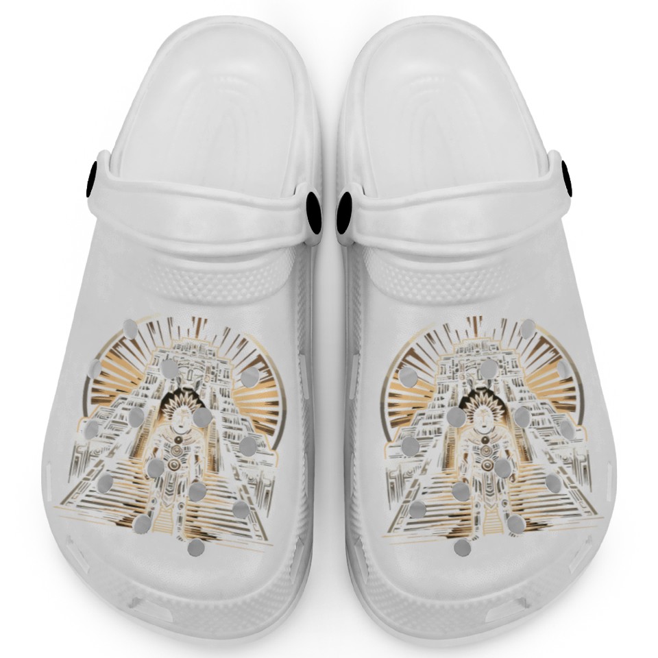 You are shopping for a stunning and trendy product Aztec Warrior Mask with Tribal Art and Ancient Clogs For Kids WHITE belong theme Clogs at Printblur
