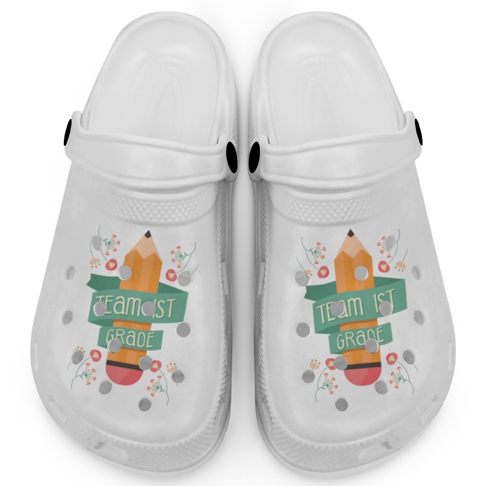 You're looking at the eye-catching product Back To School Student Teacher Team 1St Grade Clogs For Kids WHITE belong theme Clogs at Printblur