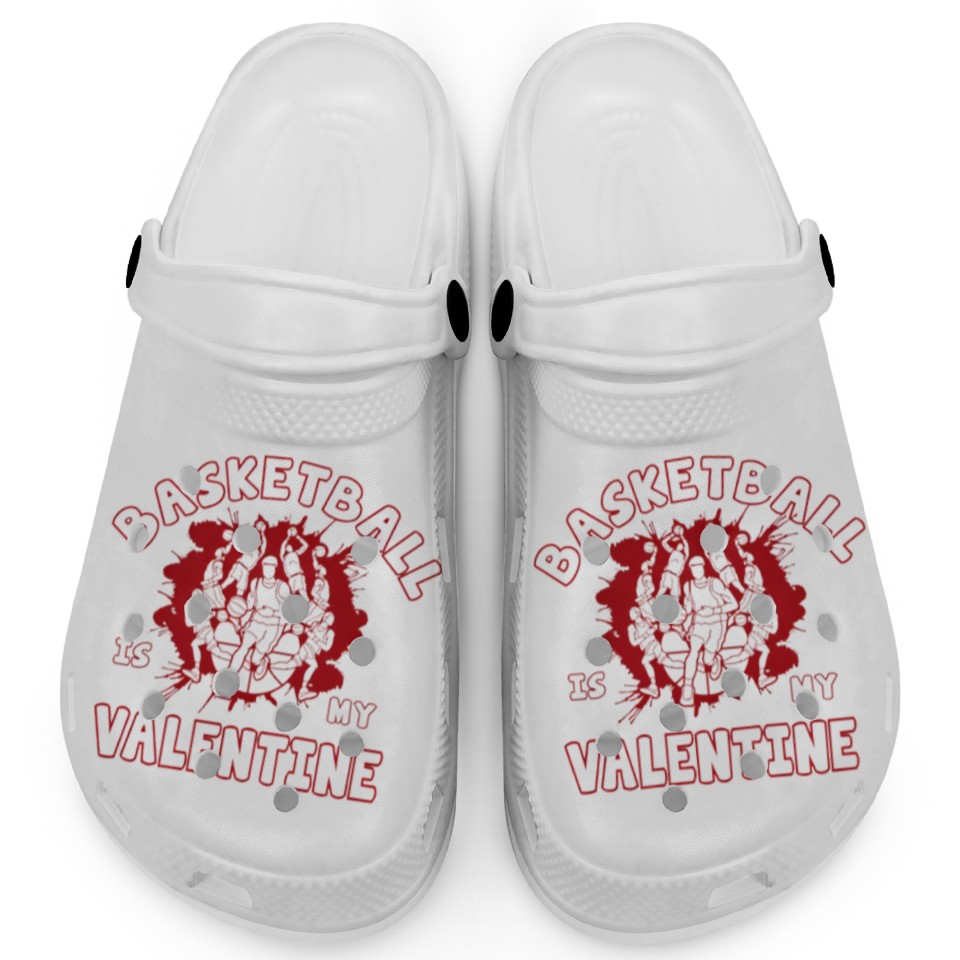 The item hot trend you're looking at is Basketball Is My Valentine Basketball Heart Clogs For Kids WHITE belong theme Clogs at Printblur
