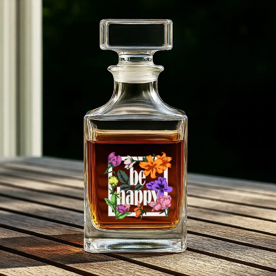 Shop for attractive Be Happy greeting on blooming garden flowers Whiskey Decanters or see more Whiskey Decanters products on https://printblur.com right now!