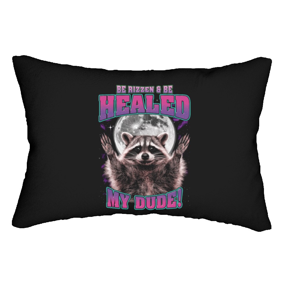 You are viewing an exclusive and elegant product Be Rizzen & Be Healed! Funny Raccoon Bootleg Lumbar Pillows For Black belong theme Lumbar Pillows at Printblur