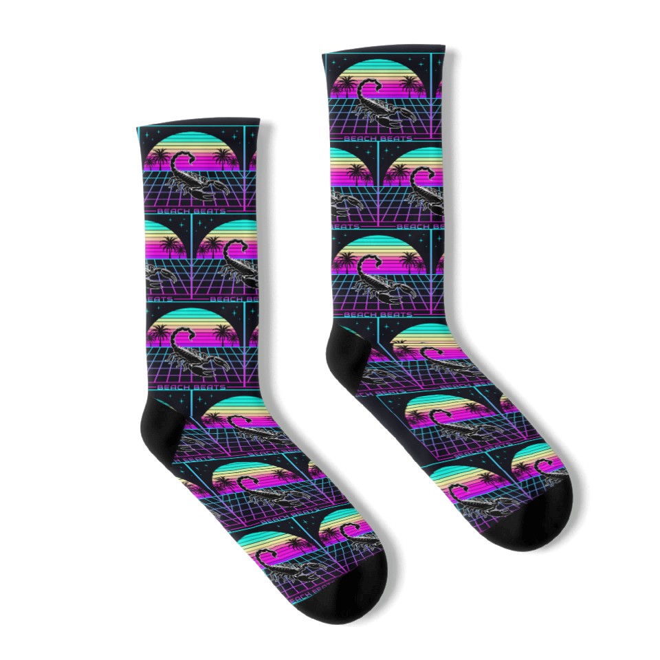 Buy eye-catching Beach Beats Retro Scorpion - Synthwave Sunset Socks or see more Socks products at Printblur shop now to explore many surprises from our shop!