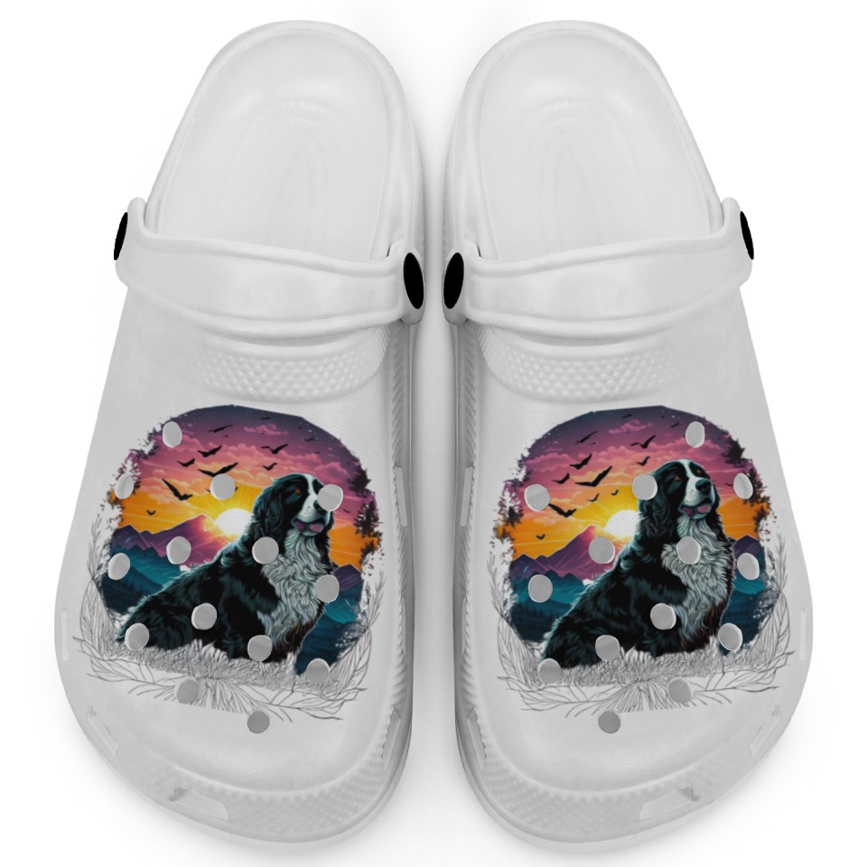 Bernese Mountain Dog with Mountain Sunrise view Clogs