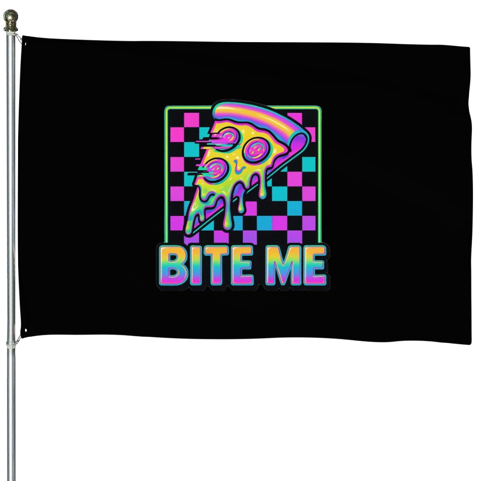 You are seeing a unique and impressive product Bite Me – Y2K Glitch Pizza Neon House Flags For Black belong theme House Flags at Printblur