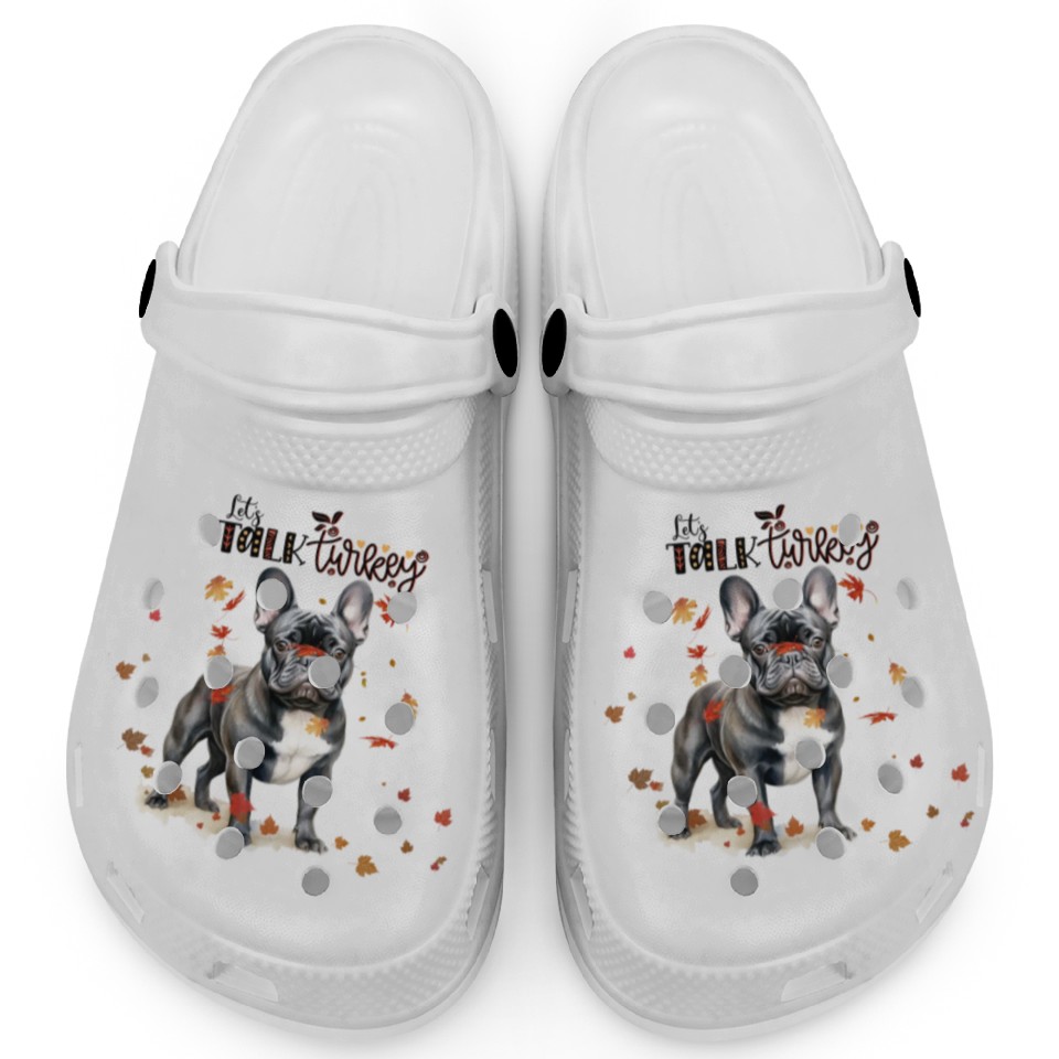The product unique design you searched for is Black French Bulldog Funny Thanksgiving Dog Clogs For Kids WHITE belong theme Clogs at Printblur
