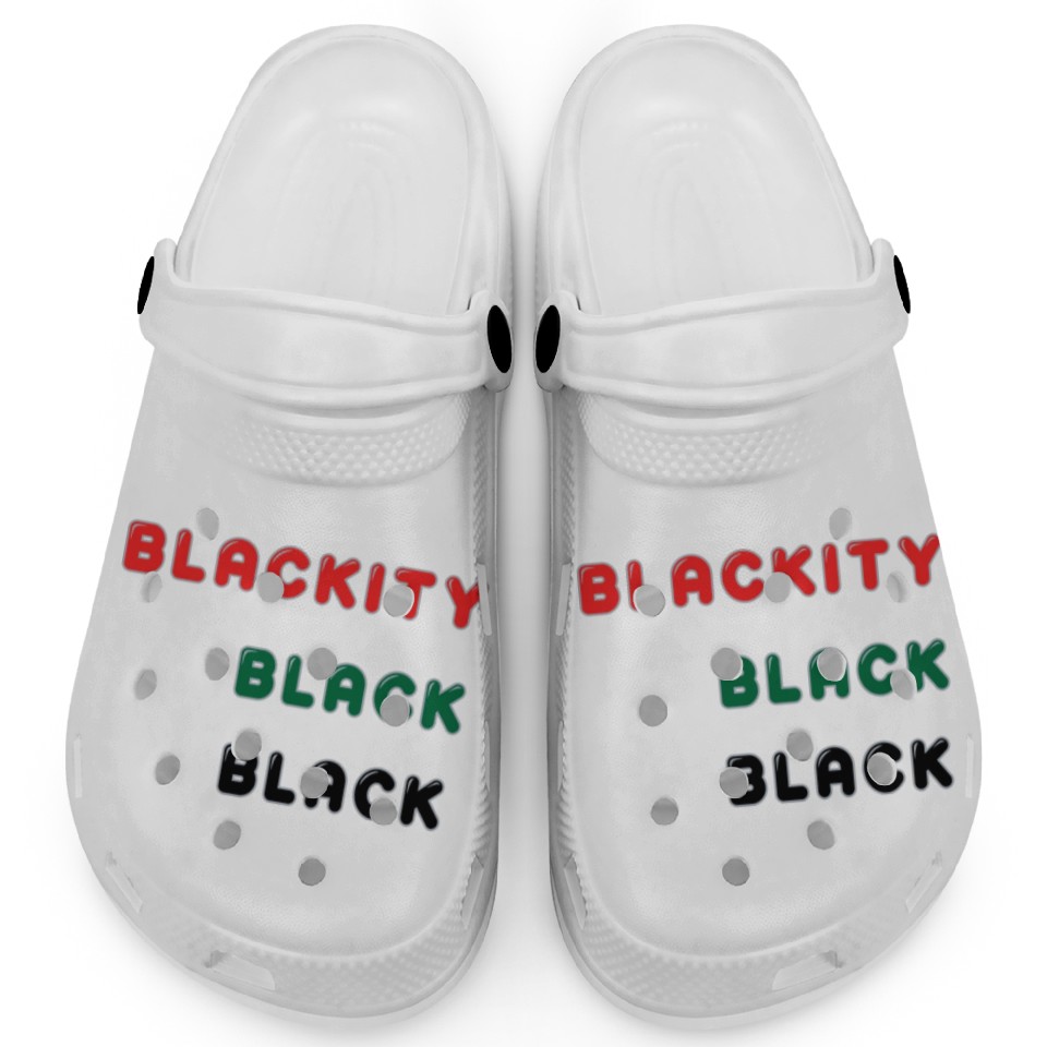 You're taking a peek at the product Blackity Black Black Clogs For Kids WHITE belong theme Clogs at Printblur
