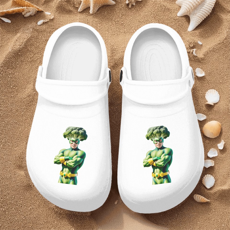 You're looking at the eye-catching product Broccoli Superhero Nurse Clogs For Men WHITE belong theme Nurse Clogs at Printblur