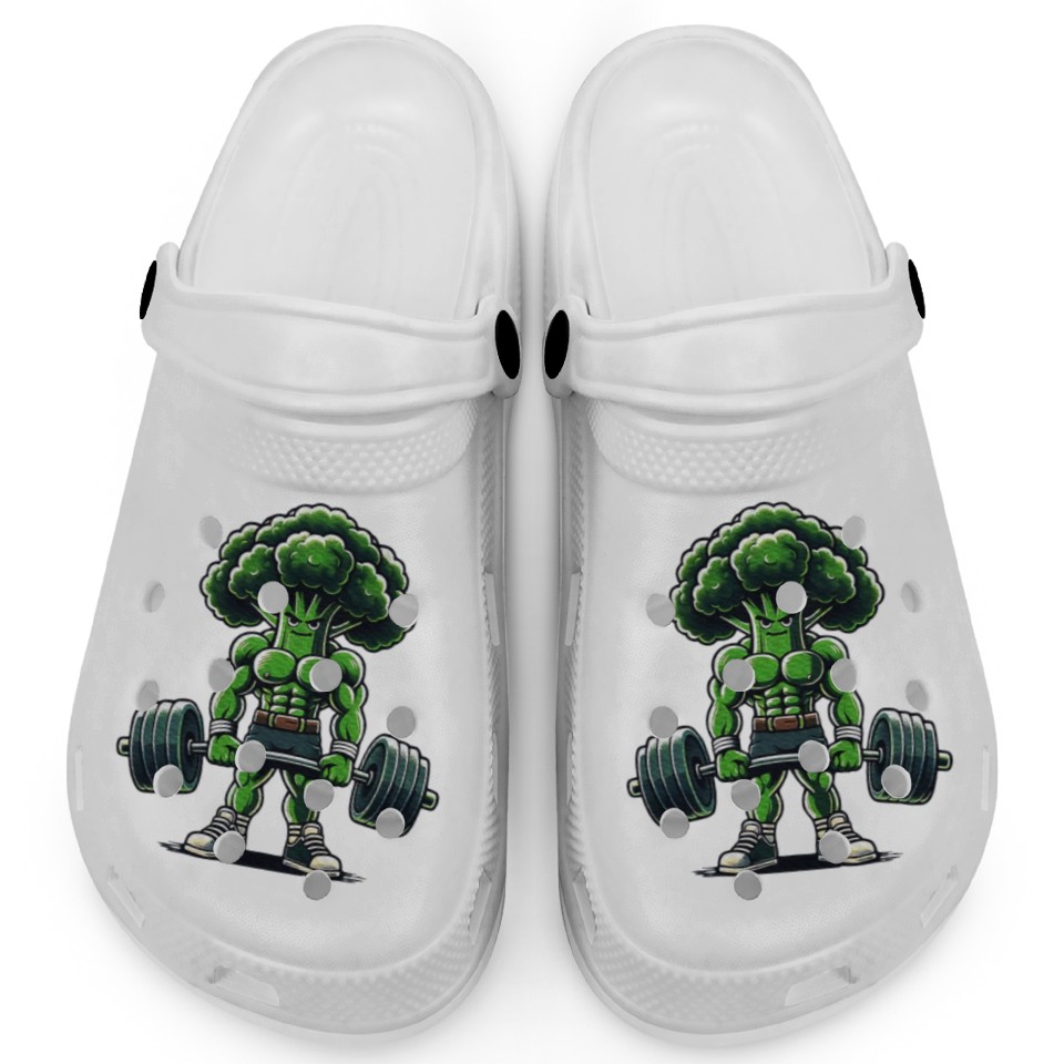 You are shopping for a stunning and trendy product Broccoli Workout Muscular Broccoli Lifting Weights Clogs For Kids WHITE belong theme Clogs at Printblur