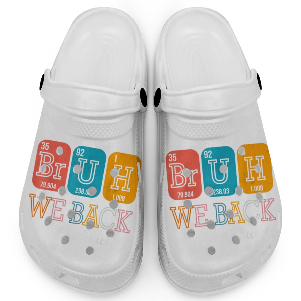 You're looking at the eye-catching product Bruh We Back Teachers Chemistry Teacher Back To Sc Clogs For Kids WHITE belong theme Clogs at Printblur