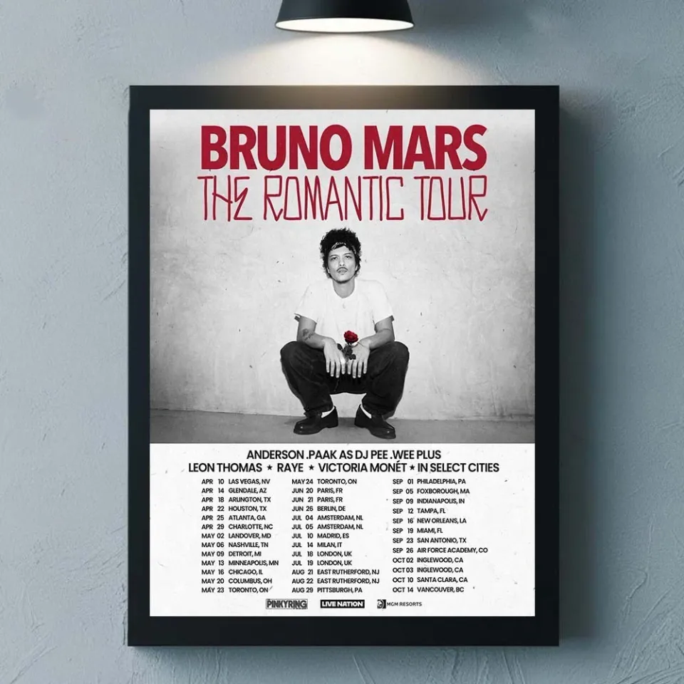 Buy stunning Bruno Mars The Romantic Tour 2026 Schedule Dates Home Decor Poster or see more Premium Matte Vertical Posters products at Printblur right now to receive many amazing discounts!