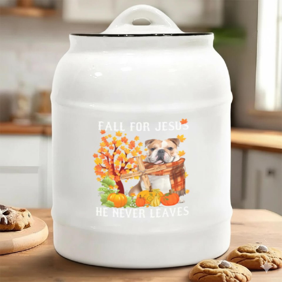 Buy eye-catching Bulldog Autumn Fall For Jesus He Never Leaves Ceramic Cookie Jars or see more Ceramic Cookie Jars products at Printblur shop now to explore many surprises from our shop!