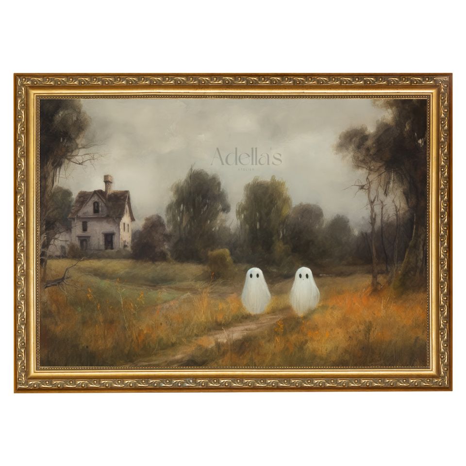 Shop for attractive Cute Ghosts in Fall Meadow w/ Haunted House, Vintage Ghost Painting, Dark Academia or see more Premium Matte Vertical Posters products on https://printblur.com right now!