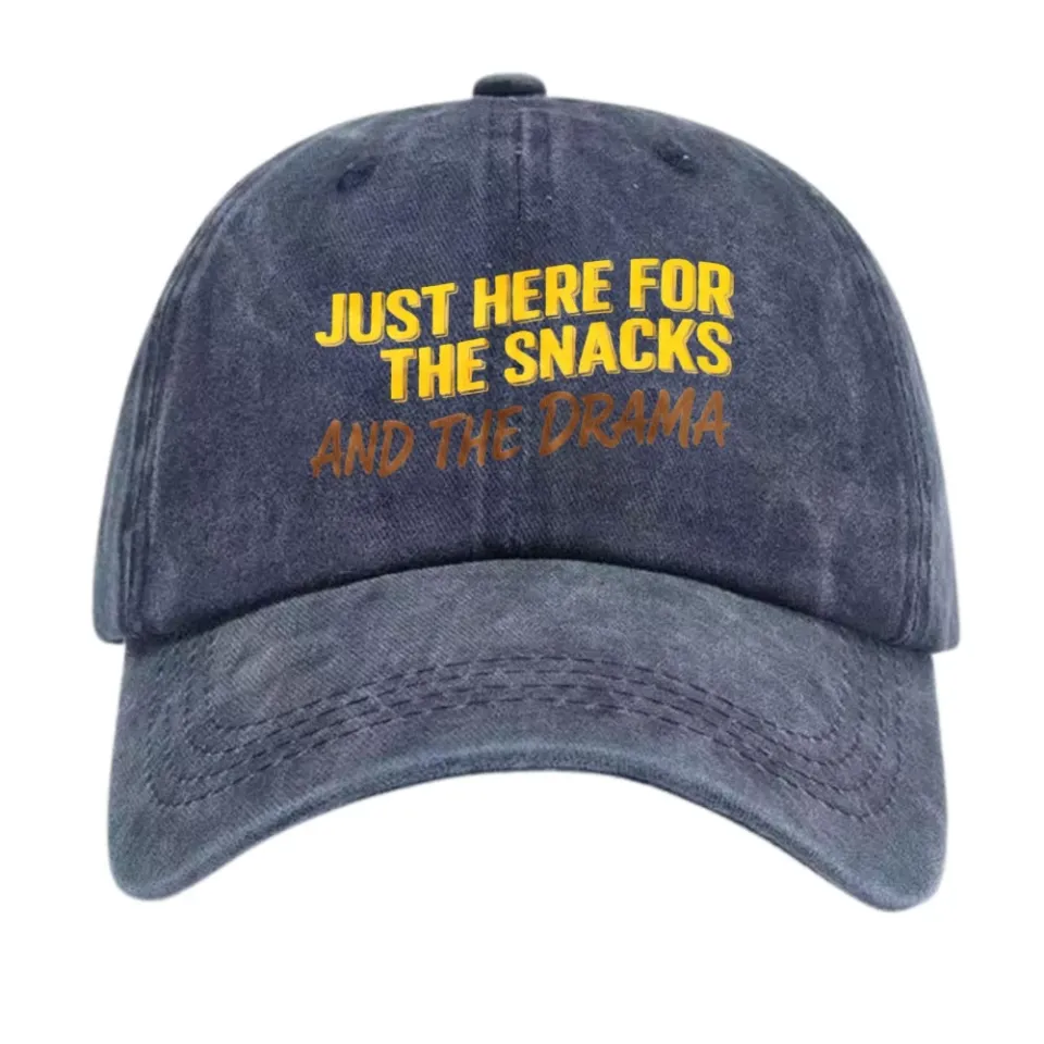 Own fascinating "Just Here For The Snacks And The Drama" Funny Vintage Baseball Cap or see more Washed Denim Baseball Caps products now from Printblur shop to enjoy your shopping time!