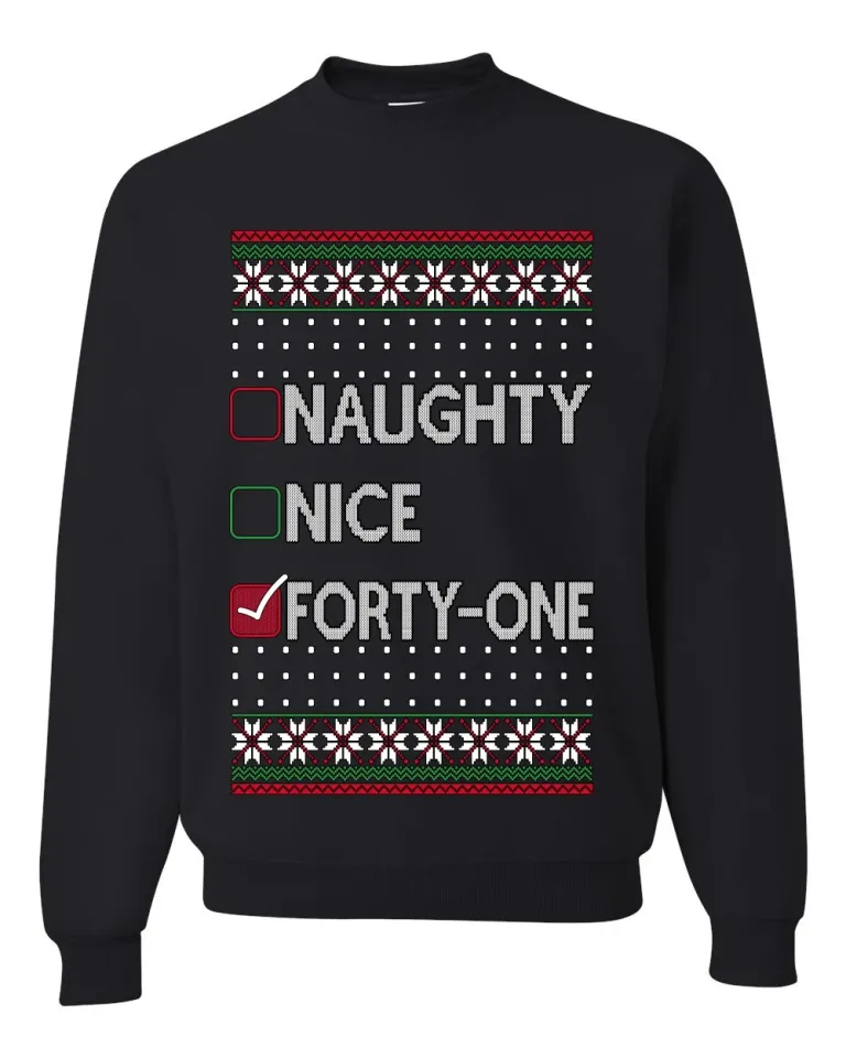Buy eye-catching Naughty Nice Forty-One Simple List 41 Ugly Christmas Sweater Crewneck Sweatshirt or see more Sweatshirts products at Printblur shop now to explore many surprises from our shop!