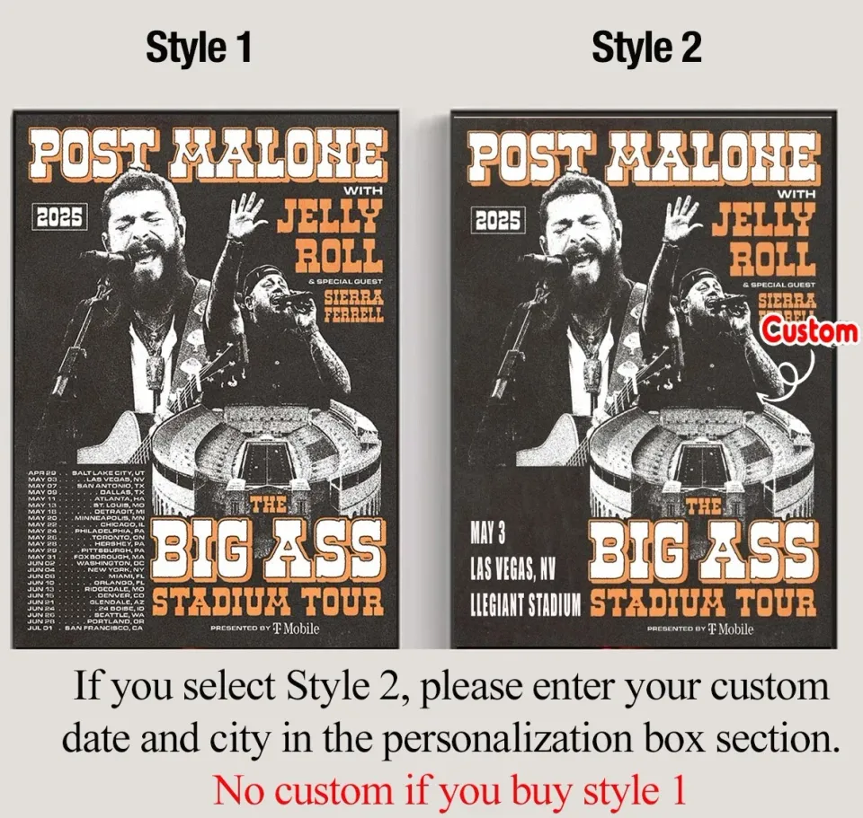Buy eye-catching Post Malone The Big Ass Stadium Tour 2025 Poster vs Jelly Roll & Sierra Ferrell or see more Premium Matte Vertical Posters products at Printblur shop now to explore many surprises from our shop!