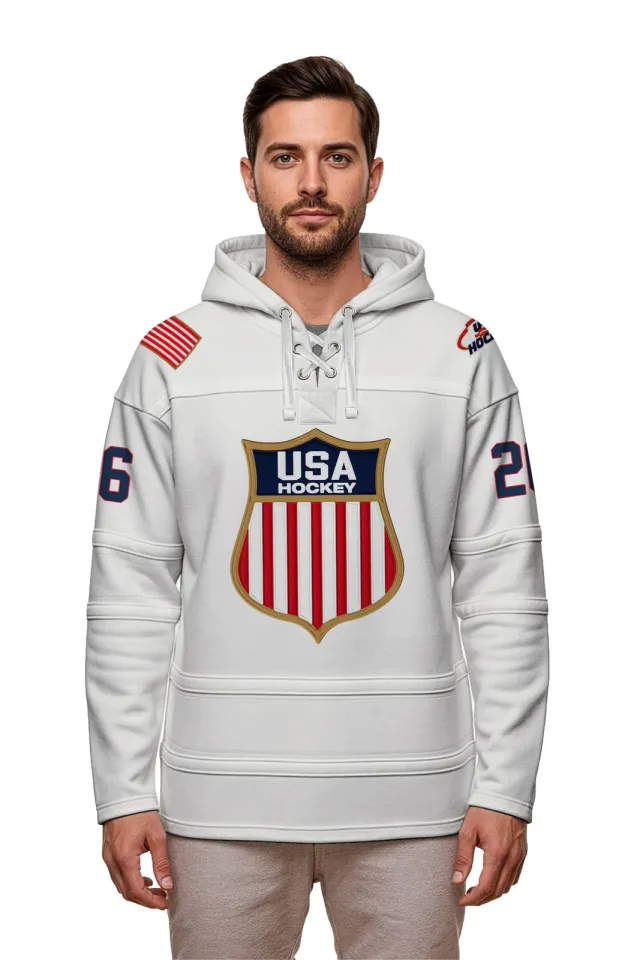 You're taking a peek at the product USA Hockey Shield Logo Vintage Look White Lace Hoodie For Men belong theme Hockey Hoodie Jerseys at Printblur