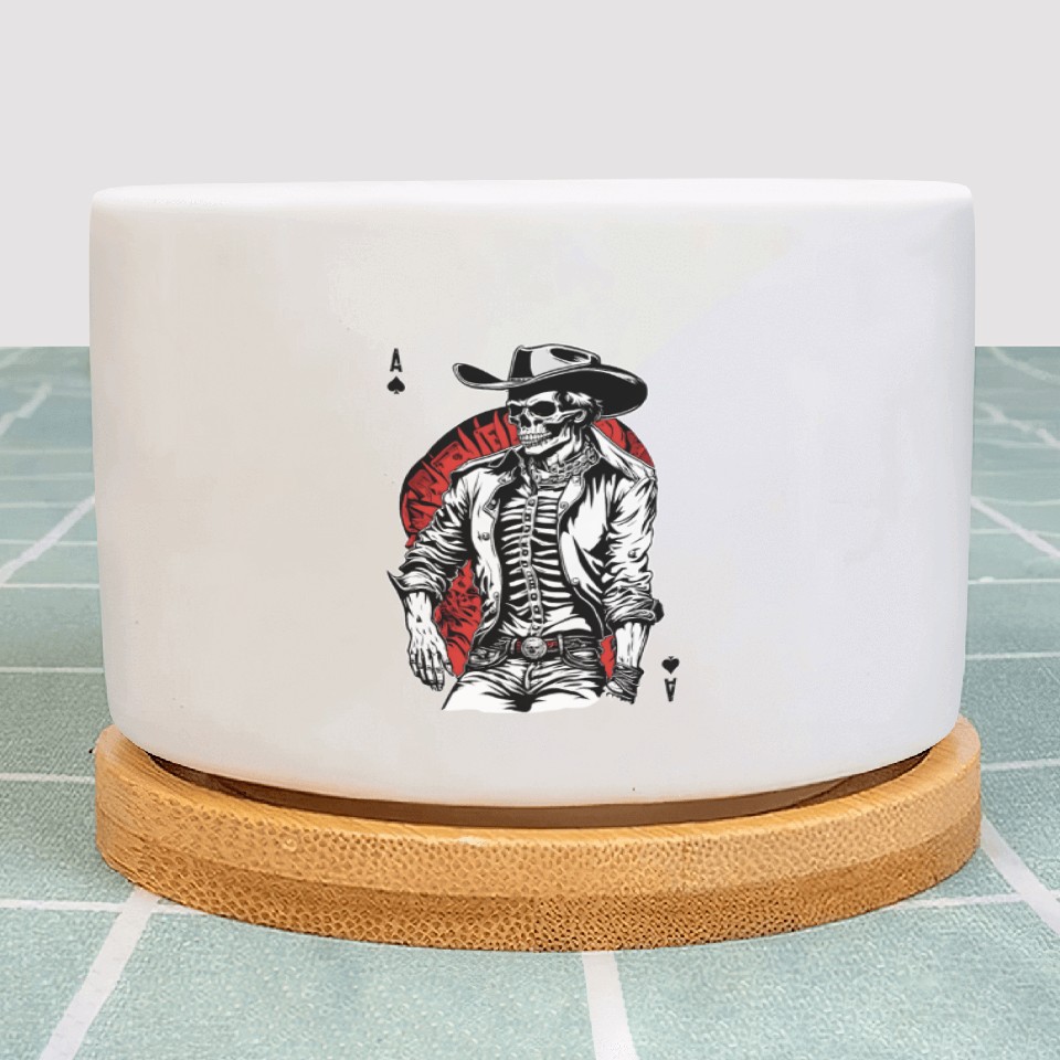 The item hot trend you're looking at is Weird Wild West: Aces High Skeleton Cowboy Plant Pots For WHITE belong theme Plant Pots at Printblur