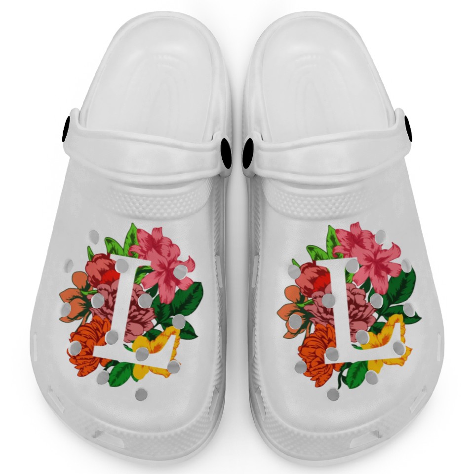 The item hot trend you're looking at is Capital letter L monogram with peony, lily flowers Clogs For Kids WHITE belong theme Clogs at Printblur