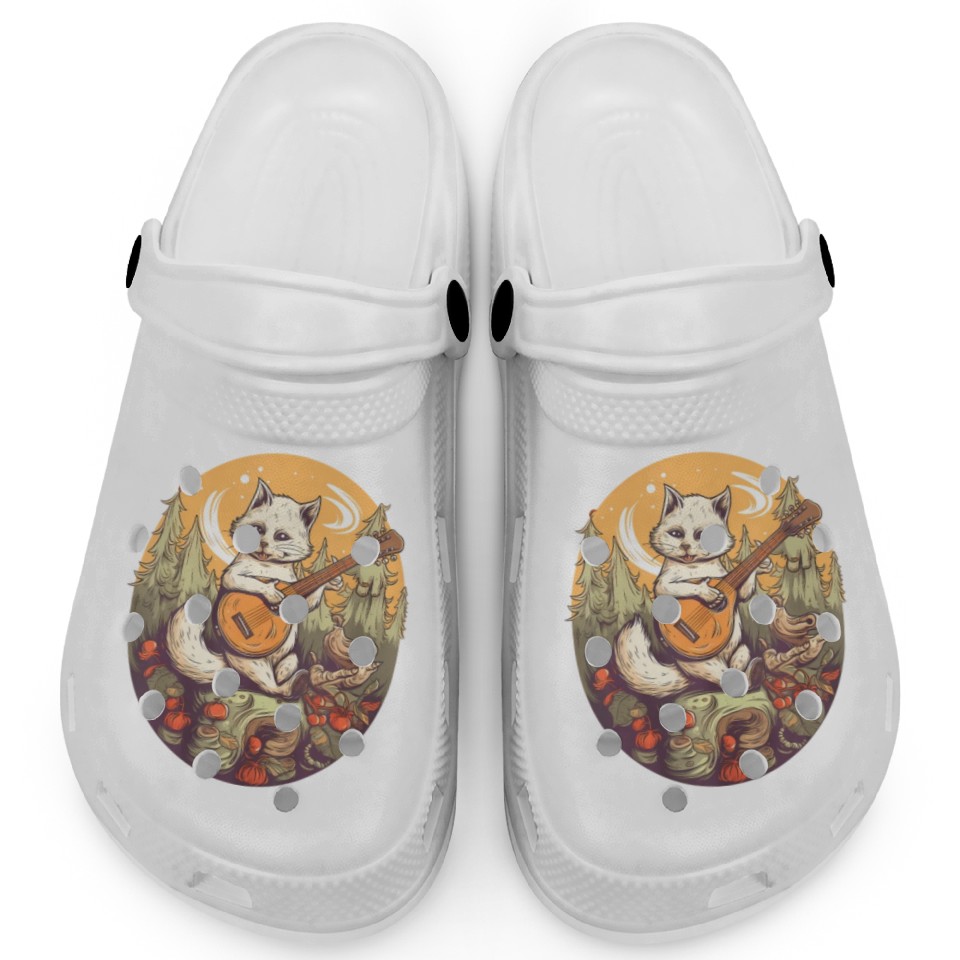 You are seeing a unique and impressive product Cat Playing Banjo In The Forest in Cottagecore Clogs For Kids WHITE belong theme Clogs at Printblur