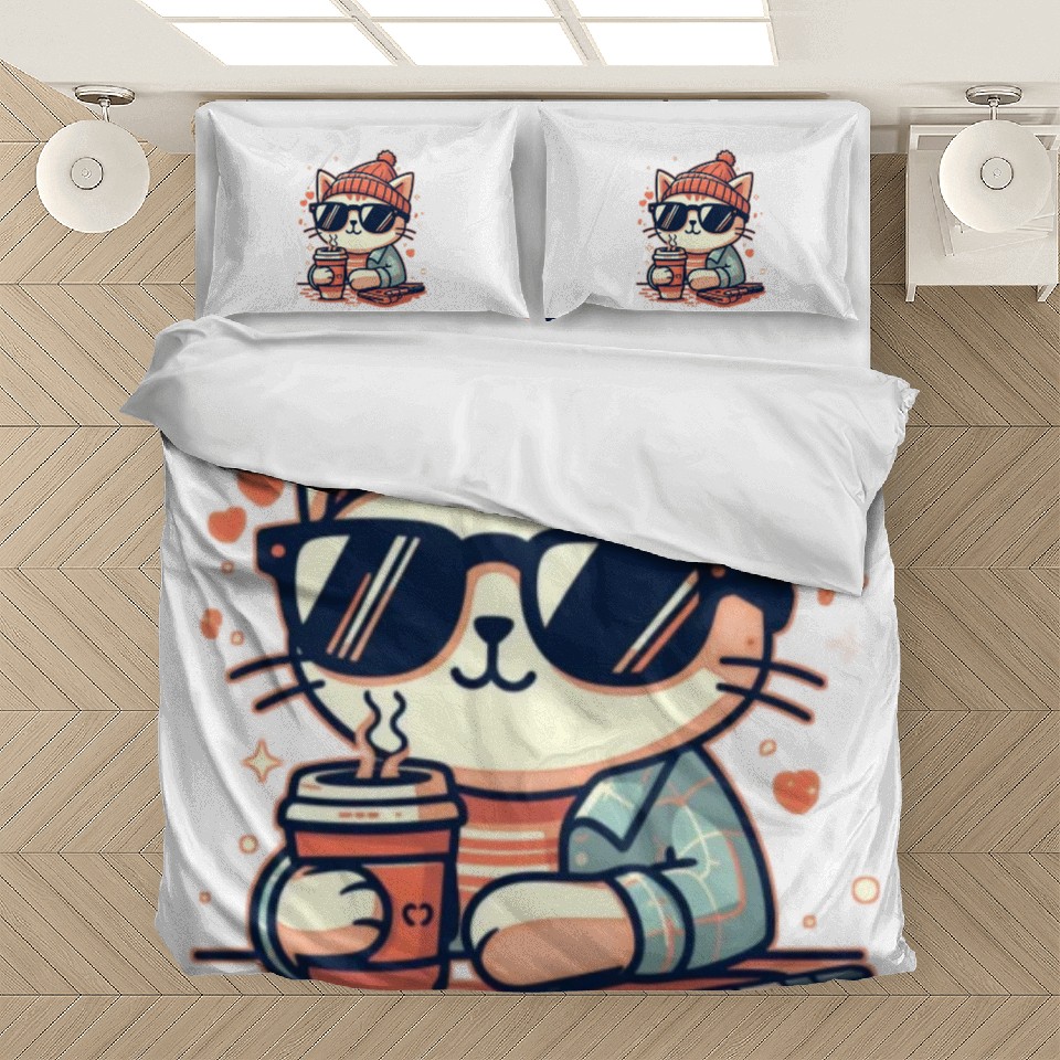 Own fascinating Cat wearing sunglasses drink coffee stickers Bedding Sets or see more Bedding Sets products now from Printblur shop to enjoy your shopping time!