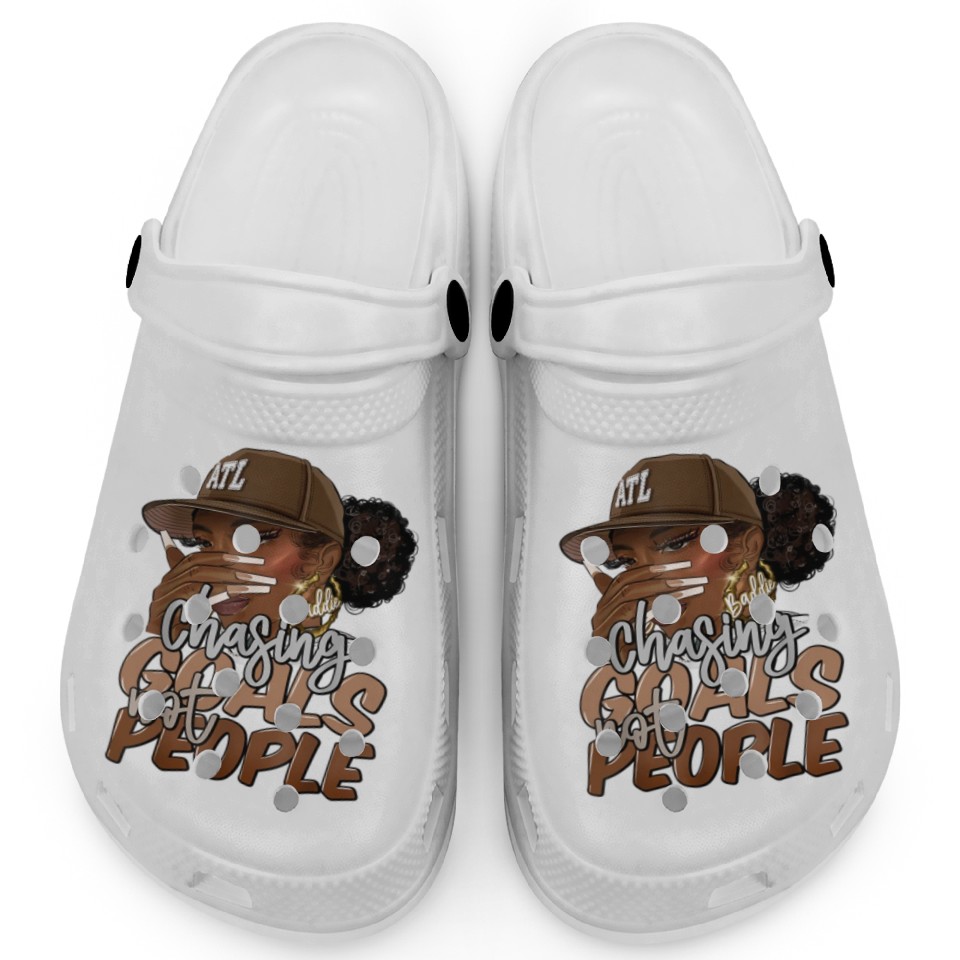 You are shopping for a stunning and trendy product Chasing Goals Not People Black Woman Black Queen Clogs For Kids WHITE belong theme Clogs at Printblur