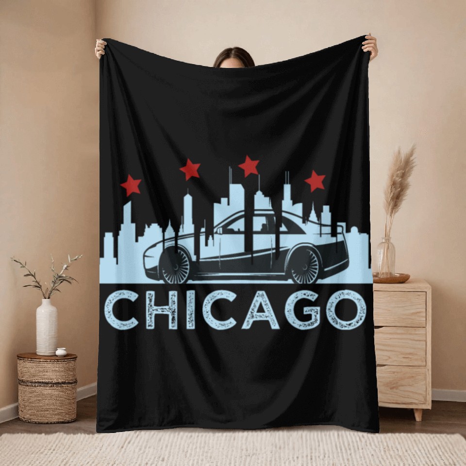 You are viewing an exclusive and elegant product Chicago Skyline Race Car Throw Blankets For Black belong theme Throw Blankets at Printblur