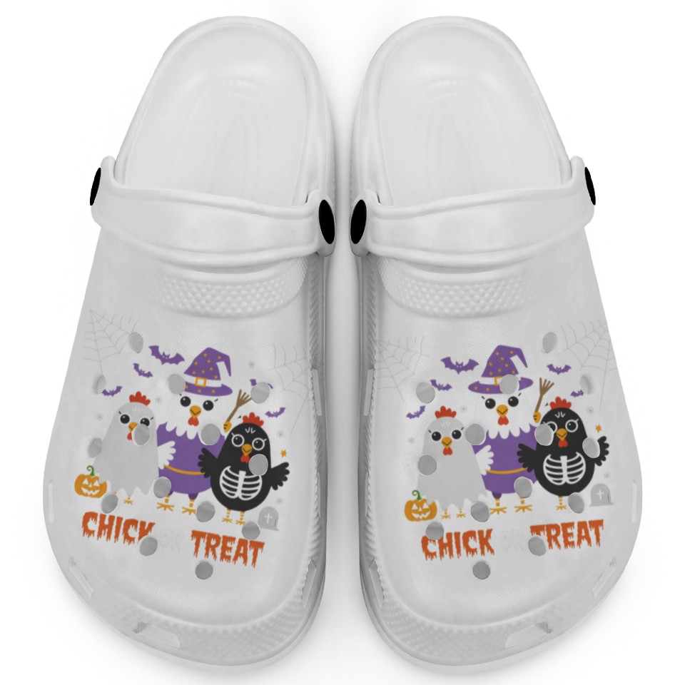 You are shopping for a stunning and trendy product Chick Or Treat Halloween Fun With Witch Chicken Clogs For Kids WHITE belong theme Clogs at Printblur