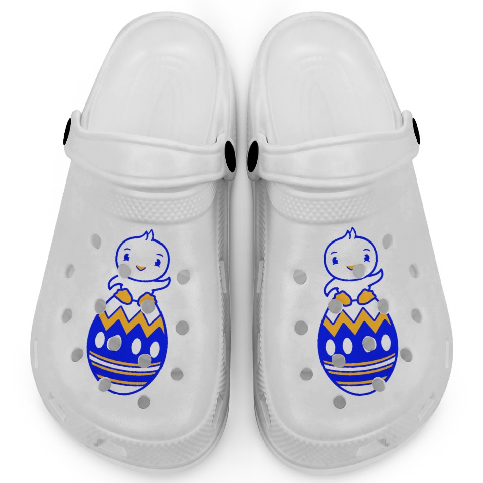 You're taking a peek at the product Chick Sits On Giant Easter Egg Waving Easter Sweet Clogs For Kids WHITE belong theme Clogs at Printblur