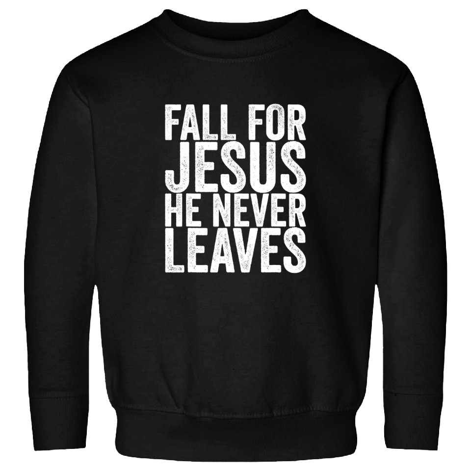 You are shopping for a stunning and trendy product Christian Jesus Christ Christian Fall For Jesus He Never Leaves 143 Bible Verse Christ Sweatshirts For Kids Black belong theme Sweatshirts at Printblur