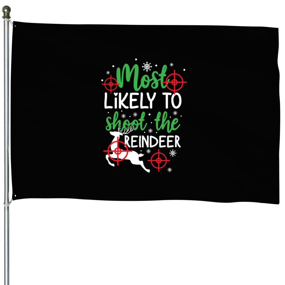 Shop for attractive Christmas Most Likely To Shoot Reindeer Xmas Gift House Flags or see more House Flags products on https://printblur.com right now!