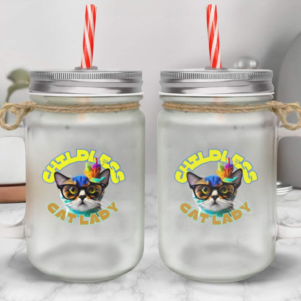 Colorful Cat with Glasses - Childless Cat Lady Mason Jar Cups