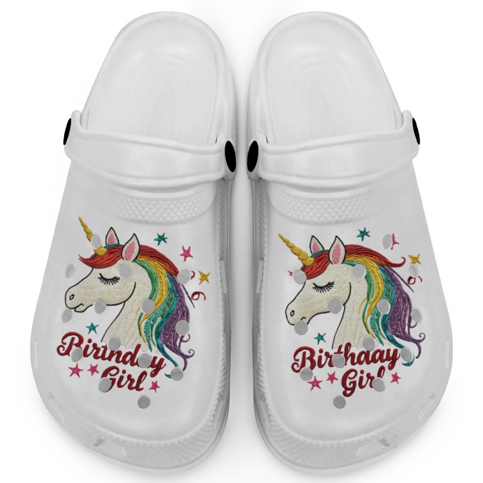 You're searching for a one-of-a-kind product Colorful Unicorn Birthday Girl Clogs For Kids WHITE belong theme Clogs at Printblur