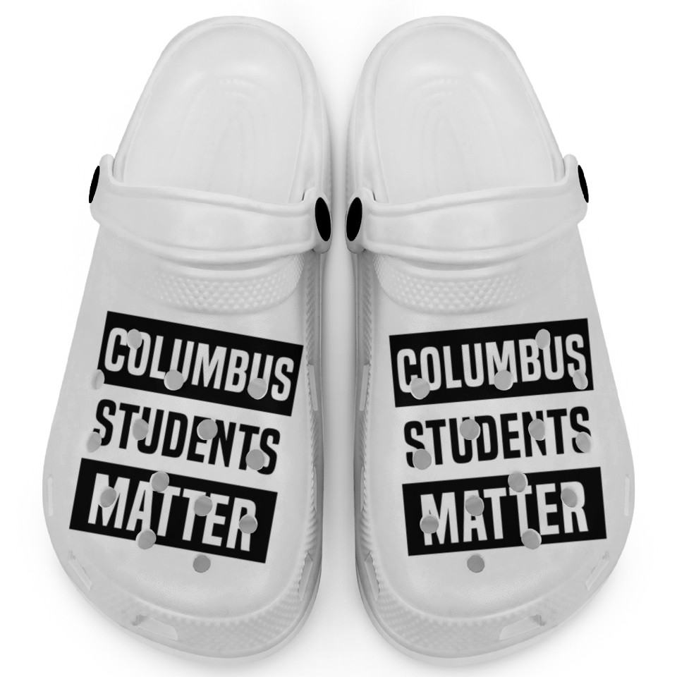 The product unique design you searched for is Columbus Students Matter School Teacher Strike Clogs For Kids WHITE belong theme Clogs at Printblur