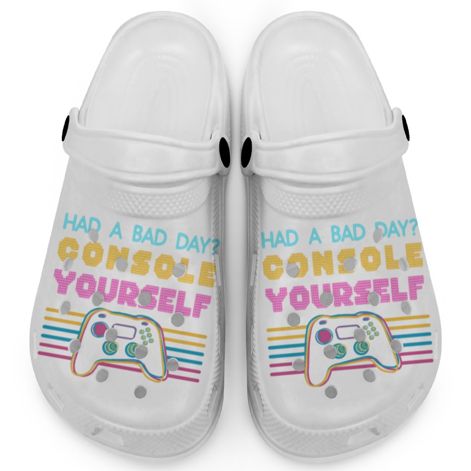 The item hot trend you're looking at is Console Yourself Funny Video Gamer Pun Youth Clogs For Kids WHITE belong theme Clogs at Printblur