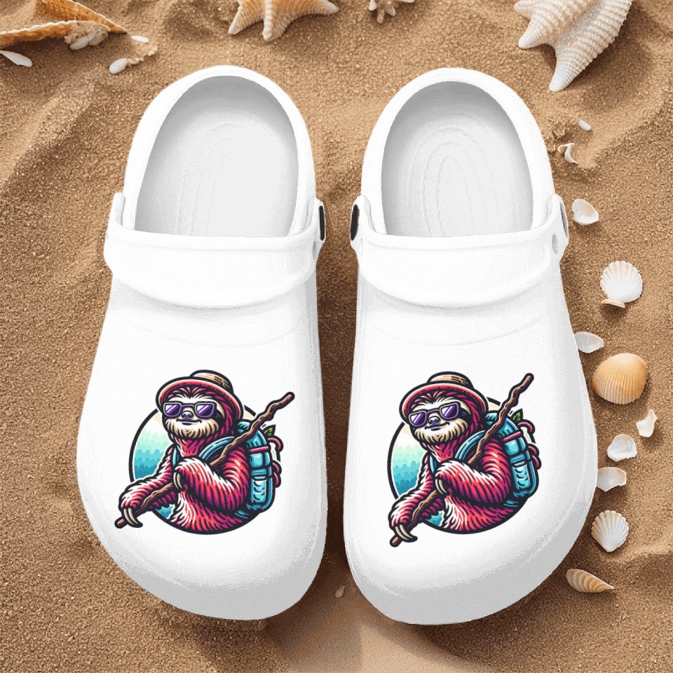The product unique design you searched for is Cool Sloth Hiking Adventure in Nature Nurse Clogs For Men WHITE belong theme Nurse Clogs at Printblur