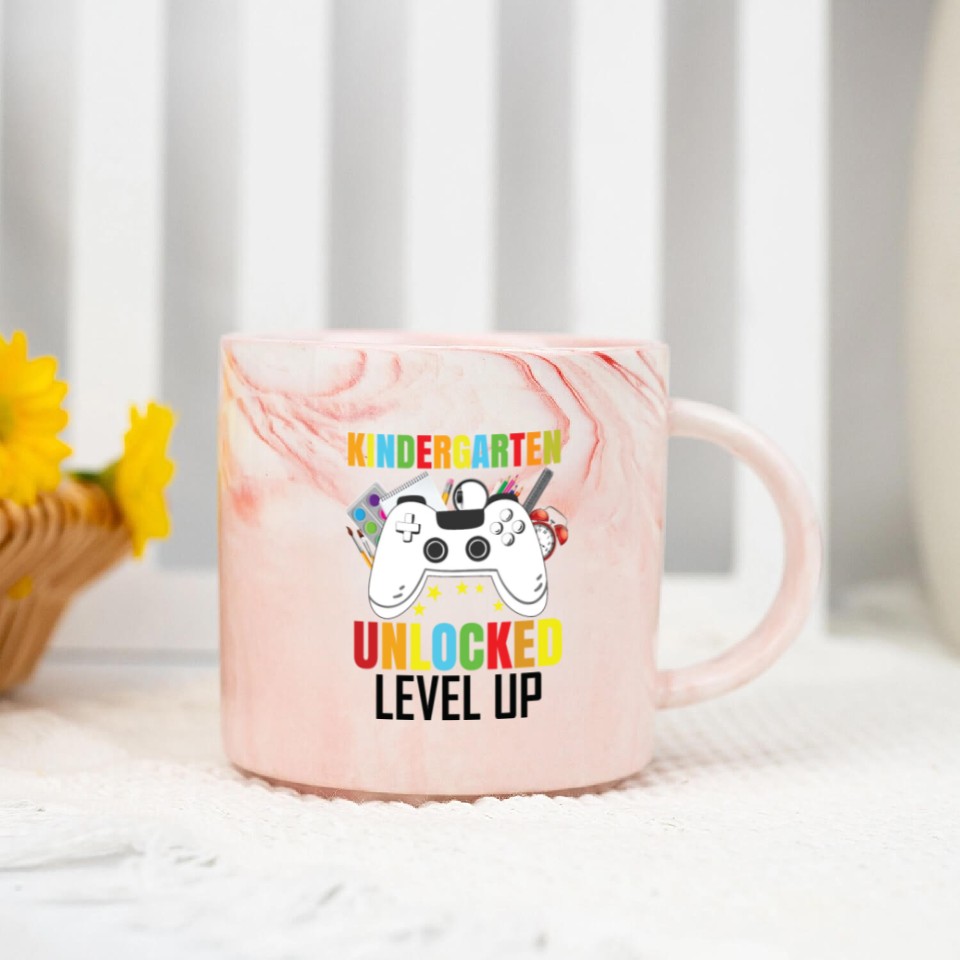 You're searching for a one-of-a-kind product Copy of Kindergarten Unlocked Level Up Marble Mugs For Pink belong theme Marble Mugs at Printblur